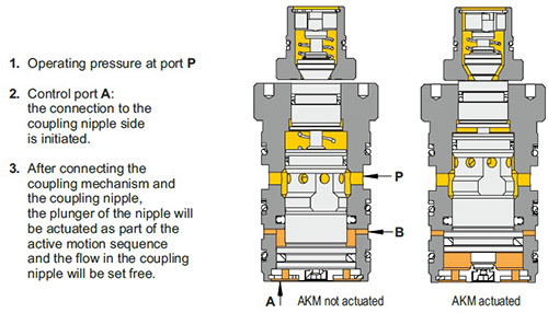| 特殊密封設計, 本體不鏽鋼材質, 可對應液體/氣體/油壓/真空, 並可選用特殊材質以對應腐蝕性液體. 其中自動耦合元件可在0.2~1.4mm間隙中進行結合而傳輸油壓。 |